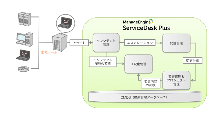 監視ツールからのアラートをイベントとして登録、その後の対応管理、問題管理、変更管理