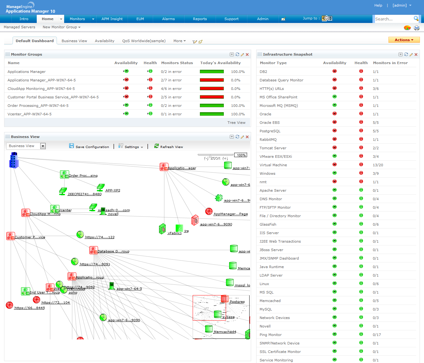 Applications Managerは、今日のビジネスのライフラインとなっているWebアプリケーション、アプリケーションサーバー、Webサーバー、データベース、クラウドサービスなど、ネットワークに接続された様々なビジネスアプリケーションを統合監視するツールです。本ツールの導入により、アプリケーションやシステムの管理者は、ITサービスの状態を把握し、予防保守や障害対応をタイムリーかつ効率的に実施することができます。