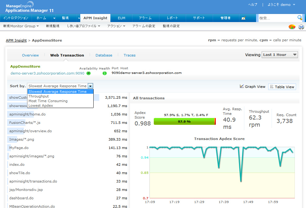 .NET環境のトランザクションの遅延が発生しているポイントの特定に役立つ情報を提供します。データベースコールを詳細に分析し、Webトランザクションのレスポンスタイムを可視化します。さらに、.NETコンポーネントのApdex *1評価機能では、アプリケーションのパフォーマンスをエンドユーザーの満足度として評価し、マネージャー層のステータス把握と迅速な判断を支援します。