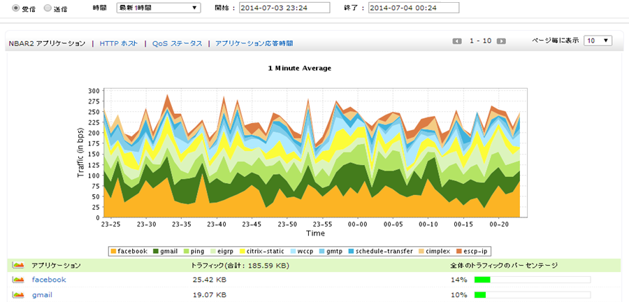 Cisco AVC情報を含むNetFlowを受信し、NBAR2アプリケーション毎、HTTPホスト毎、QoSクラス階層毎の帯域使用情報、およびNBAR2アプリケーションの応答時間に関するレポートを表示します。FacebookやGmail、Twitterなど、1,000を超えるNBAR2アプリケーションを識別します。