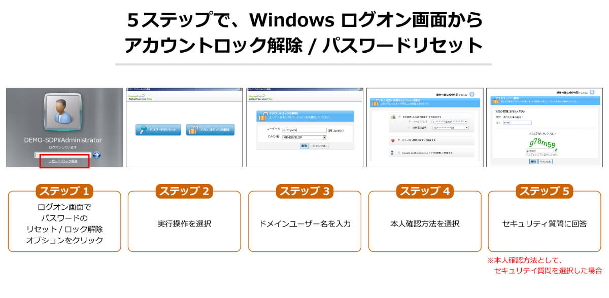 ドメインユーザーがADのアカウントロック解除/パスワードリセットを実行する際に、次のマルチファクター認証を用いて本人確認をすることでセキュリティを強化しています。- セキュリティ質問 (ユーザー自身のみが知っていることとして)