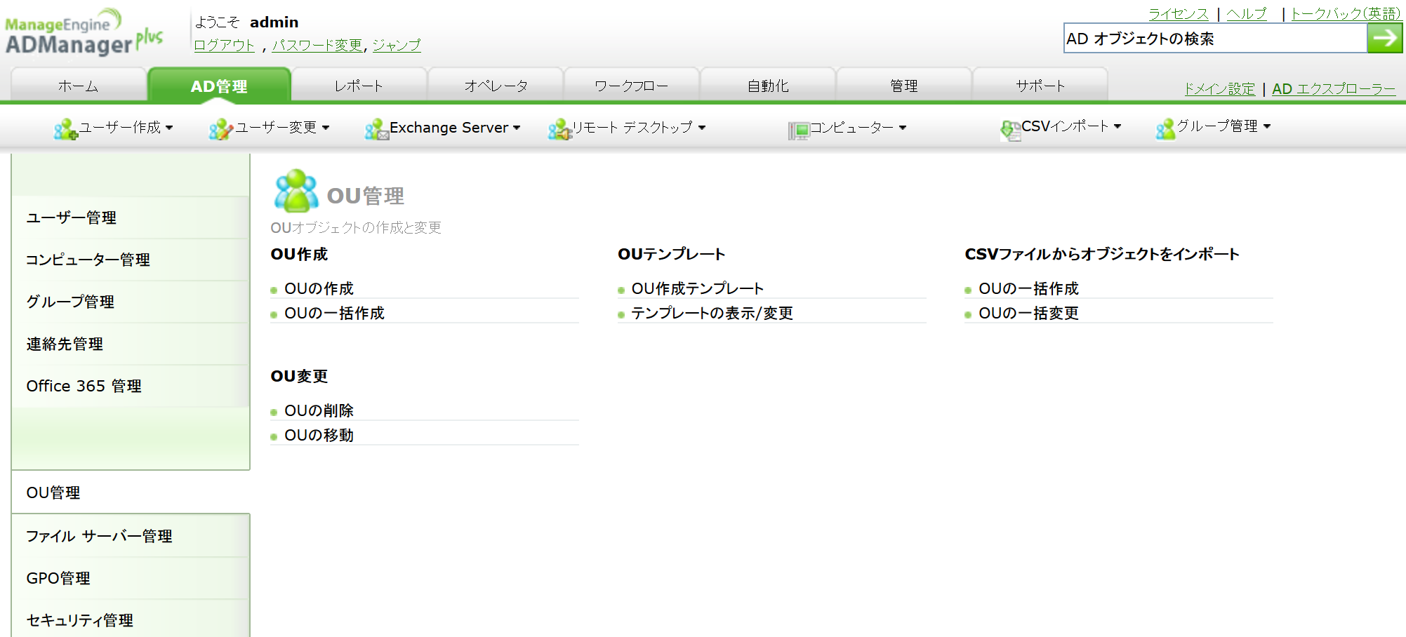 ADManager Plusから、OUの作成、変更、移動、削除ができます。個別に操作する他、CSVファイルのインポートにより、一括で作成や変更を加えることも可能です。あらかじめ特定の項目の値を指定済みのOU作成用テンプレートを用意することで、Active Directoryの更新作業を効率的に実施できます。