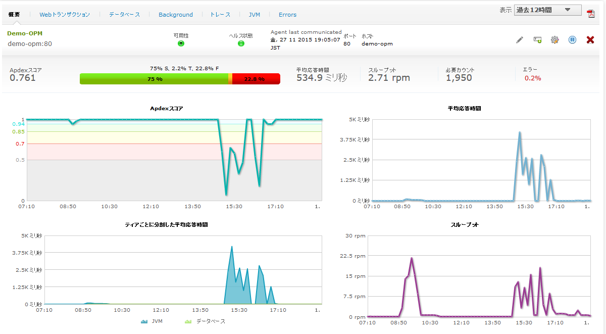 また、Web トランザクションのパフォーマンスをユーザー満足度の指標(Apdex スコア※)として表します。この指標によりト ランザクション処理の詳細をさらにトレースするかを判断できるだけではなく、Web アプリケーションに改善の余地があるか も判断できます。