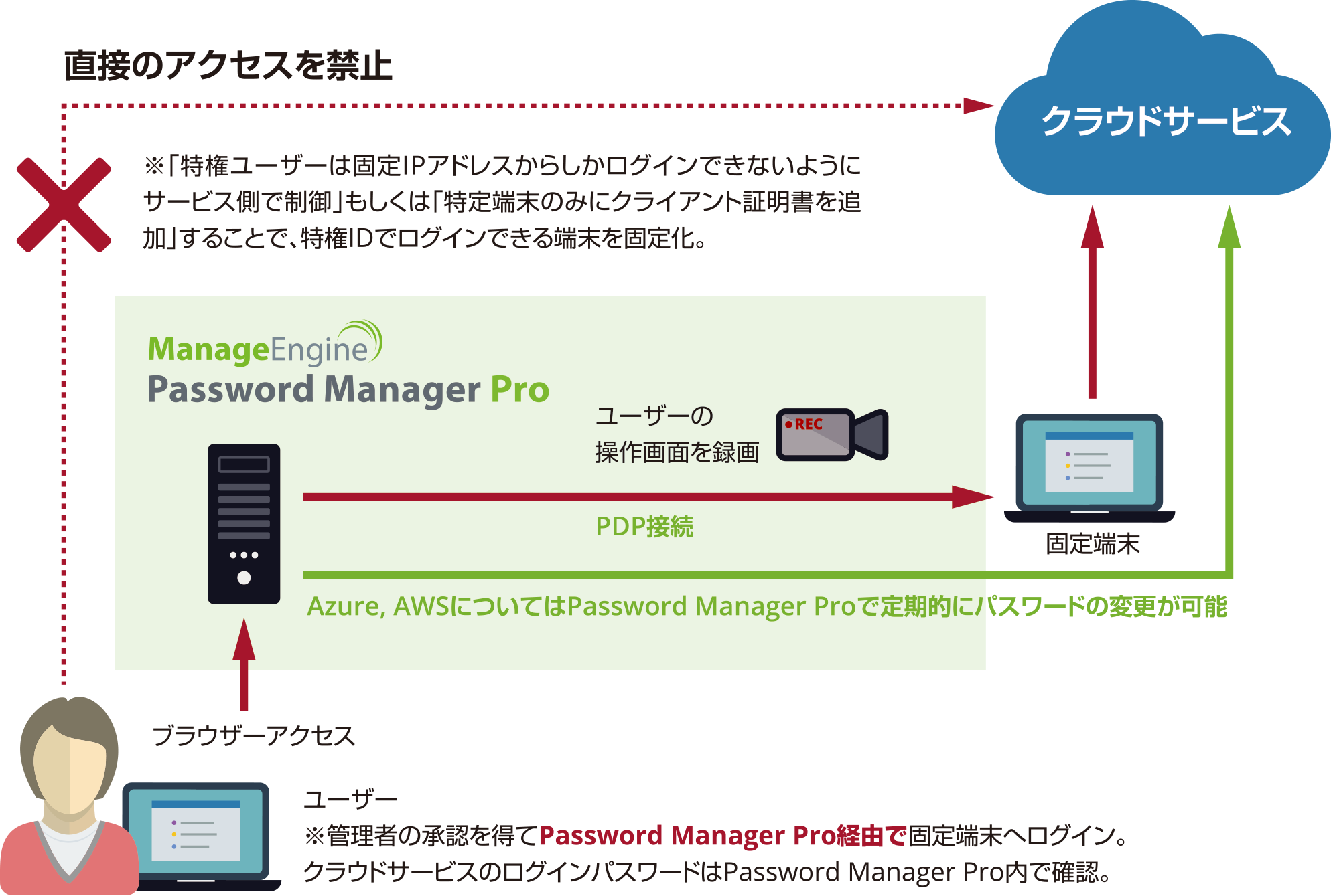 例えば、クラウドサービス側で特権ID利用時の接続元グローバルIPアドレスを固定したり、クライアント証明書を利用した認証を追加したりすることで、特権IDでログインできる端末を固定化します。この特定端末へログインする際、Password Manager Proを経由することで、クラウドサービスへログインする際の「申請/承認」プロセスを徹底し、ログイン中の特権ユーザーのクラウドサービス上での操作画面を録画できます(下図参照)。