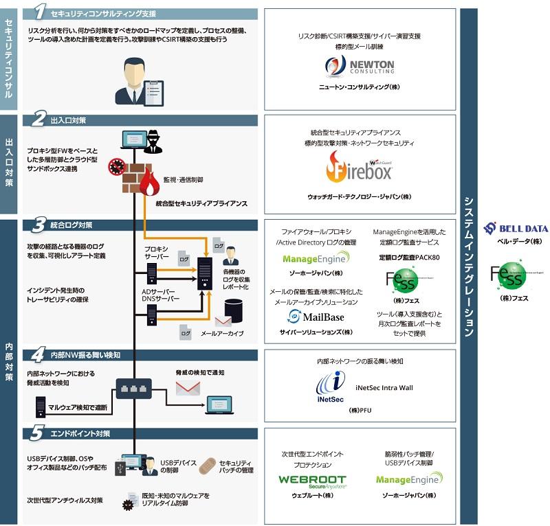 「標的型攻撃」というキーワードは1つでも、その対処には、「出入口対策」から「内部対策」、内部対策の中でも「ログ監査」から「エンドポイント管理」までの多層防御が求められるため、中堅・中小企業の担当者が単独で対策を企画・推進することは困難を極めます。このような課題を解決するため、標的型攻撃の包括的なソリューションを1つの窓口から提供し、顧客ニーズに合わせて柔軟に提供できる仕組みとして、2016年10月にBAPTが発足しました(*)。