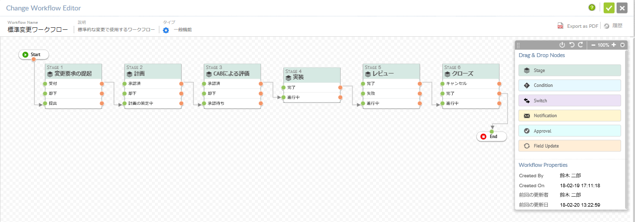 本リリースでは、ServiceDesk Plusの変更管理機能が強化されたことにより、直感的なインターフェースから変更ライフサイクルの複数ステージ、ステータス、通知、承認といったアクションをマウス操作で設定できるようになりました。