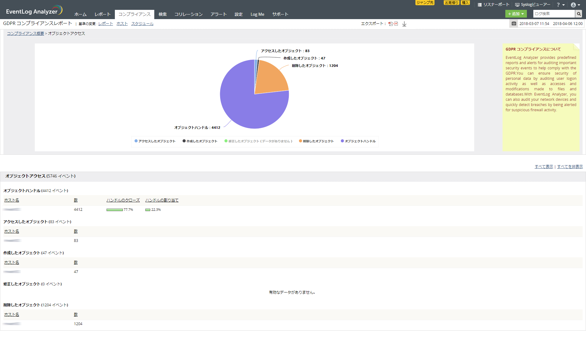 2018年5月25日より、EU(ヨーロッパ連合)においてGDPR(General Data Protection Regulation)が施行されます(※1)。今回のリリースでは、「EventLog Analyzer」で収集したログを基にGDPRに準拠したレポートを作成できるようになりました。GDPRの各要件に対応した、オブジェクトアクセスやログオン、ポリシーの変更等のレポートが作成できます。