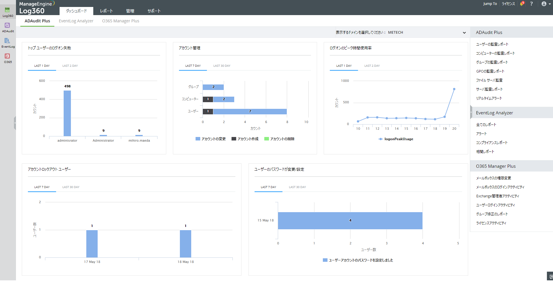 Active Directoryと連携を行うことで、一度のWindows認証によって「Log360」/「EventLog Analyzer」/「ADAudit Plus」の3製品に自動ログインすることができます。