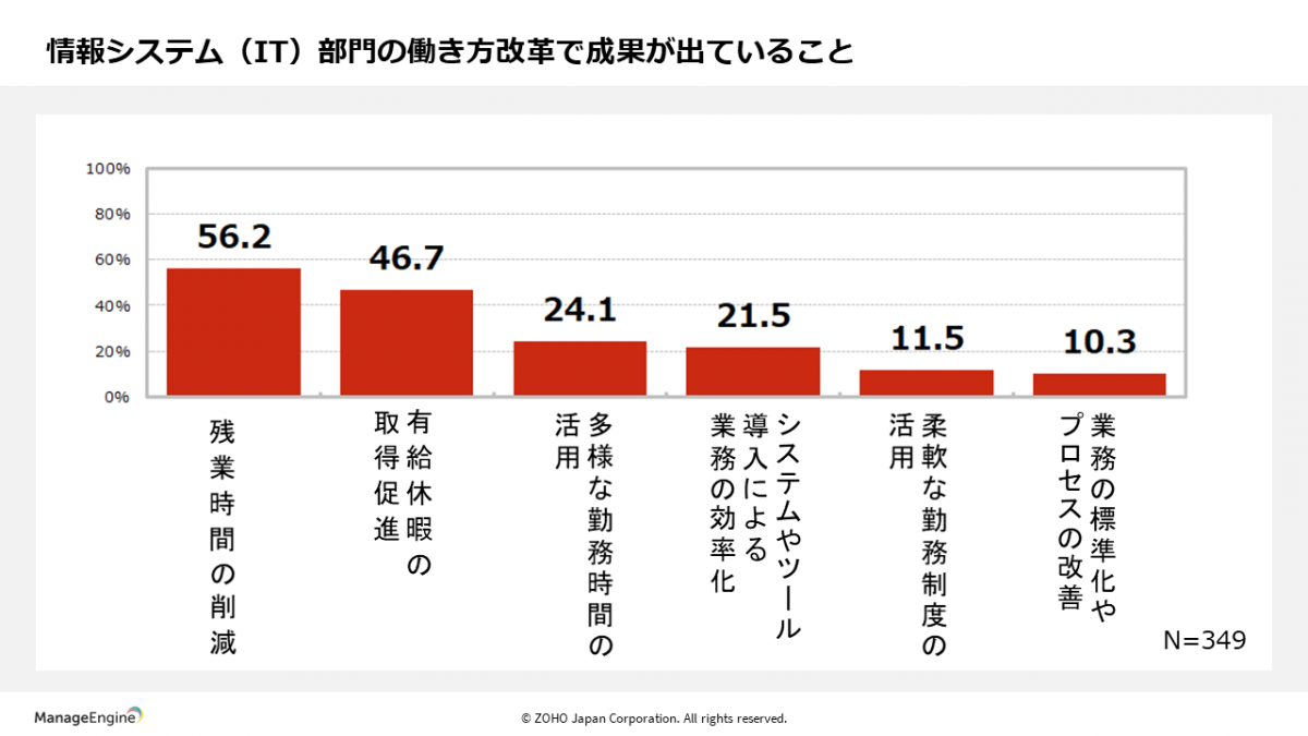 2019年9月20日 - ゾーホージャパン株式会社(代表取締役:迫 洋一郎、本社:横浜市)は本日、企業調査レポート「情報システム(IT)部門における働き方改革調査レポート」を発表しました。 本調査は、昨今トレンドである働き方改革が真の意味で実施されているのかを確認すべく実施いたしました。対象としては企業全体での取り組みの他に、情報システム(IT)部門に焦点を当てています。