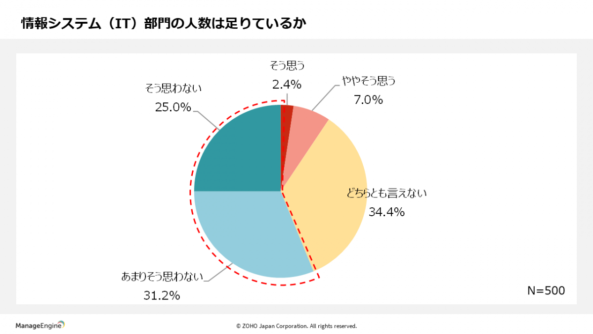 情報システム(IT)部門の人数は足りているかという設問で肯定的な回答は10%程度にとどまりました。「そう思わない」、「あまりそう思わない」という回答は企業規模に関係なく50%を超えました。情報システム(IT)部門の課題を問う質問においても「慢性的な人員の不足」が約47%で最も多い回答となっています。(図4参照)