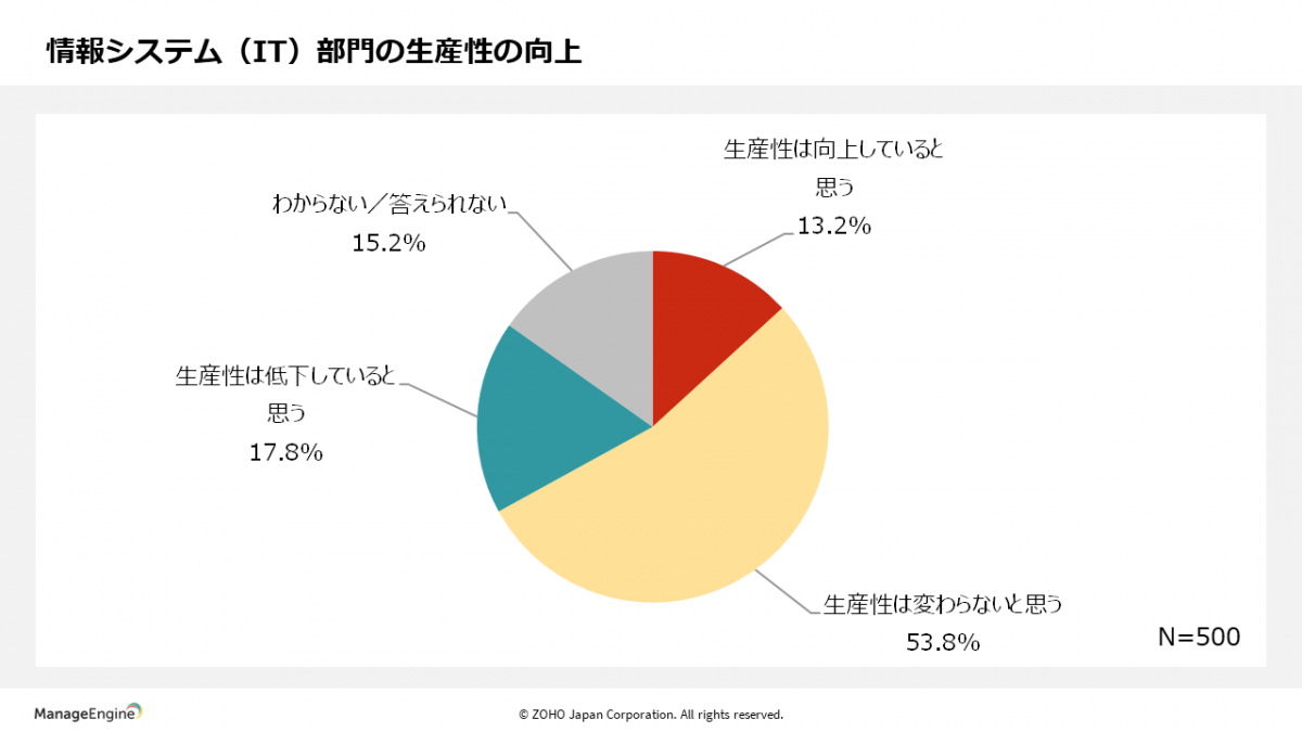 直近1年間における情報システム(IT)部門の生産性の向上は、「変わらないと思う」が約54%と多くを占めました。生産性が「向上していると思う」は約13%。「生産性は低下していると思う」が約18%と、生産性向上に肯定的でない意見が多く示されています。(図5参照)