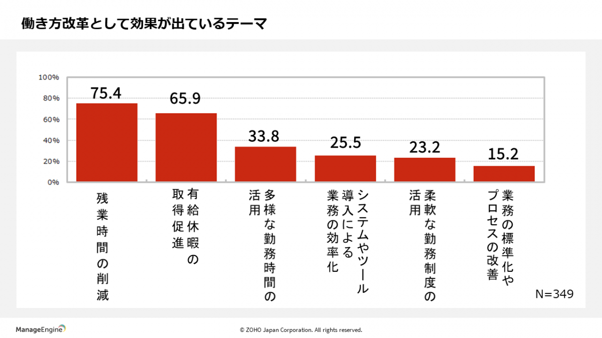 500名を対象に調査を実施したところ、349名(全体の69.8%)もの所属企業が働き方改革に「積極的に取り組んでいる」または「部分的に取り組んでいる」と回答しています。 働き方改革に関する企業全体の取り組みは「長時間労働の是正」が85%を超え、効果がでている項目でも「残業時間の削減」が75%を上回りともに1位となりました。 一方で効果がでているテーマにおいて「システムやツール導入による業務の効率化」が25.5%、「業務の標準化やプロセスの改善」は15.2%となり、本質的な生産性に関わる業務の効率化についての効果は高くない結果となっています。(図1参照)