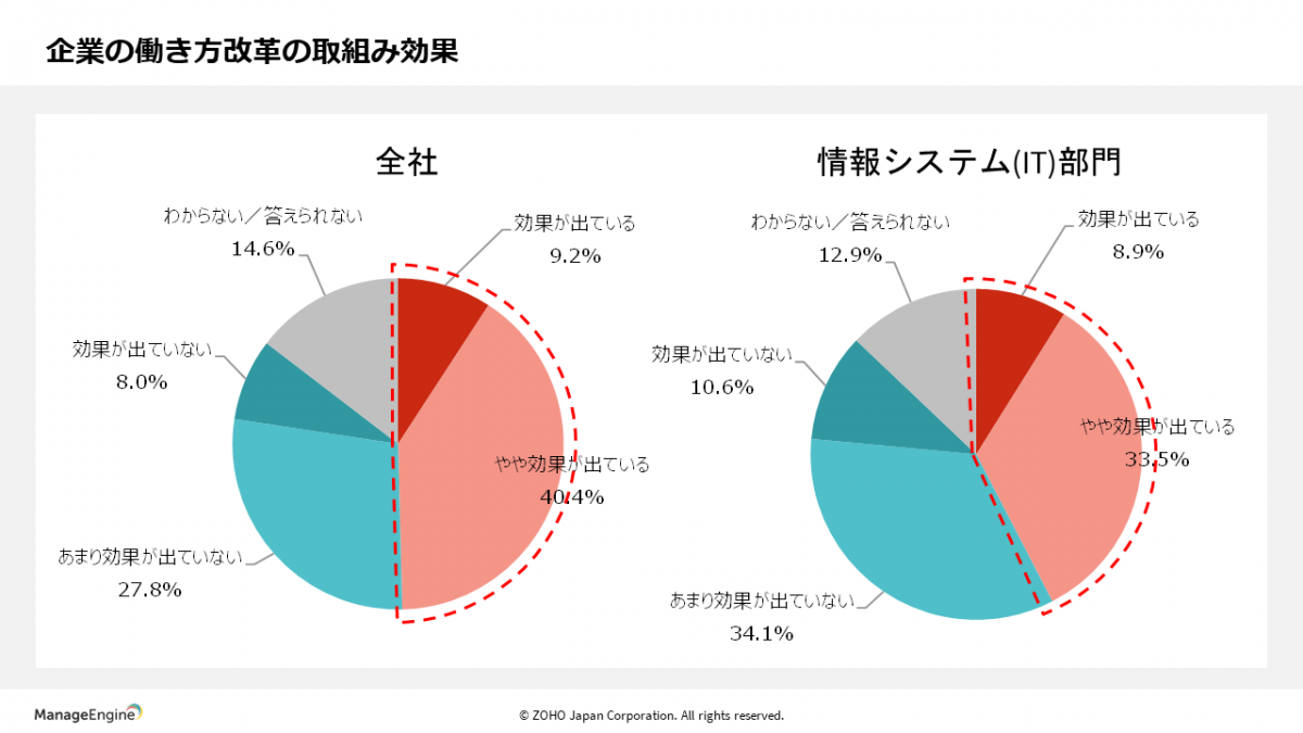 情報システム(IT)部門に注目した場合、働き方改革の効果について「効果が出ている」、「やや効果が出ている」の回答は前者と比べた場合、-7.2pointという結果となりました。また「効果がない」、「あまり効果が出ていない」という否定的な回答は全社に比べ+8.9pointとなり、情報システム(IT)部門への効果はやや立ち遅れていることを示唆しています。(図2参照)