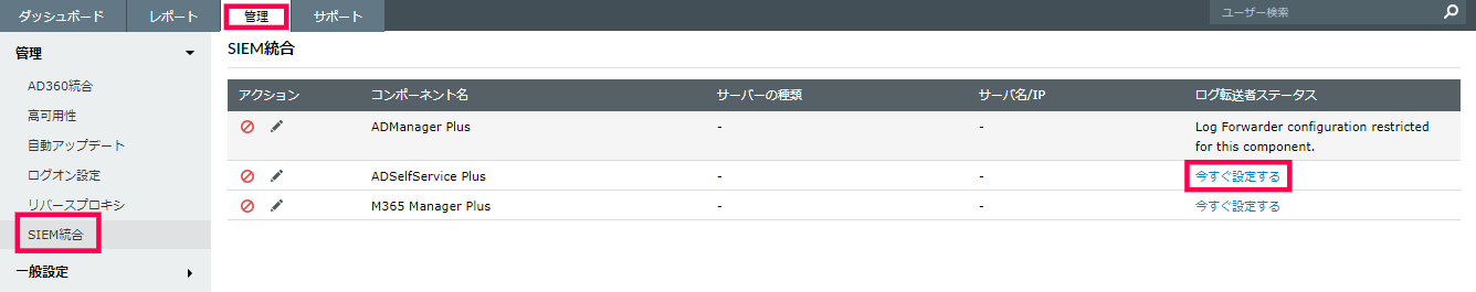 - コンポーネントをログ転送用のSIEMツールと連携するには、それぞれの[今すぐ構成]リンクまたは編集アイコン