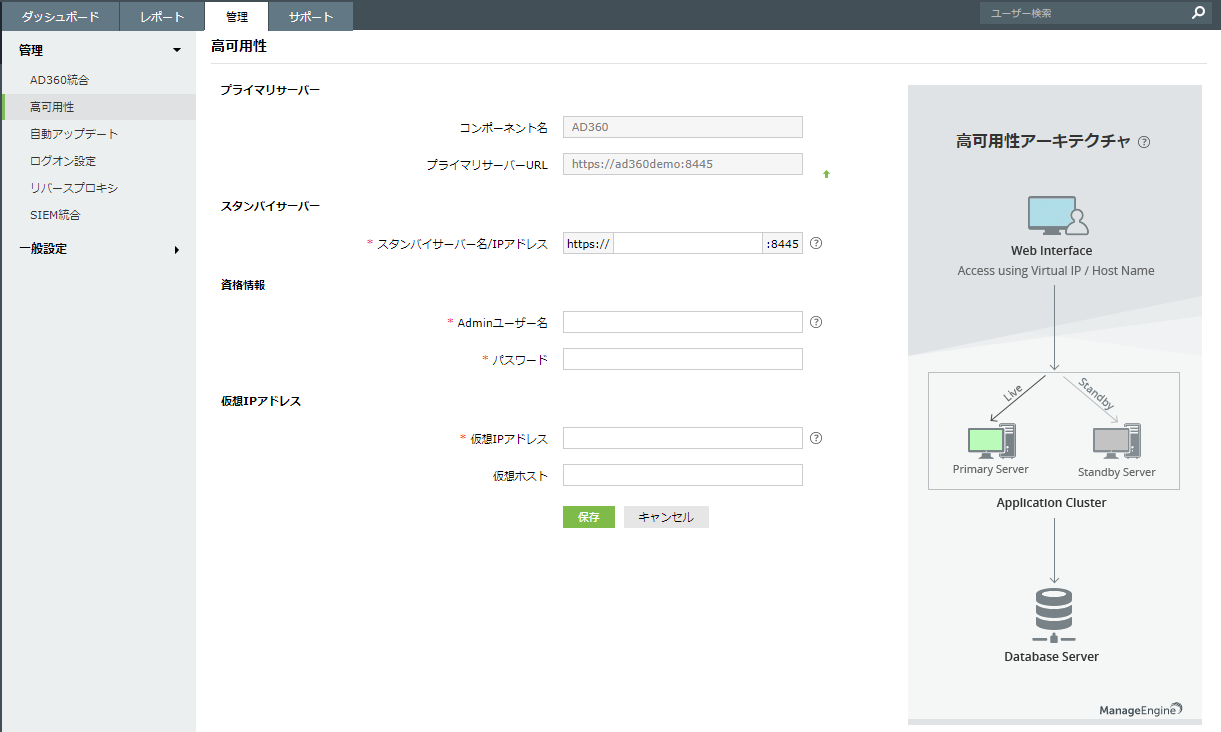 例えばIP範囲が172.21.9.xの場合、プライマリサーバー、スタンバイサーバー、および仮想IPもIP範囲172.21.9.xにある必要があります。 - [管理者]→[管理]→[高可用性]に移動します。