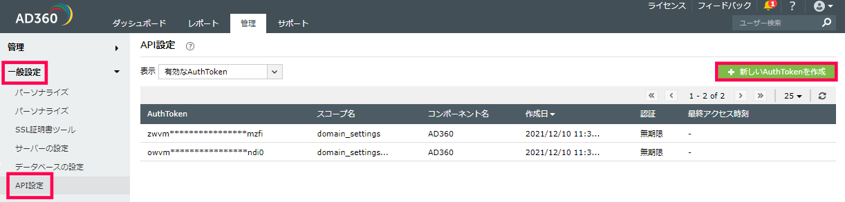 作成したすべてのAuthTokenは、AD360の[API設定]ページにあります。ここから、有効期限、スコープ、作成日、最終アクセス時刻など、AuthTokenのさまざまな詳細を確認できます。AuthTokenを取り消して、完全に無効にすることもできます。AuthTokenを管理するには、以下の手順に従ってください。