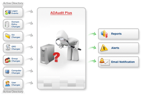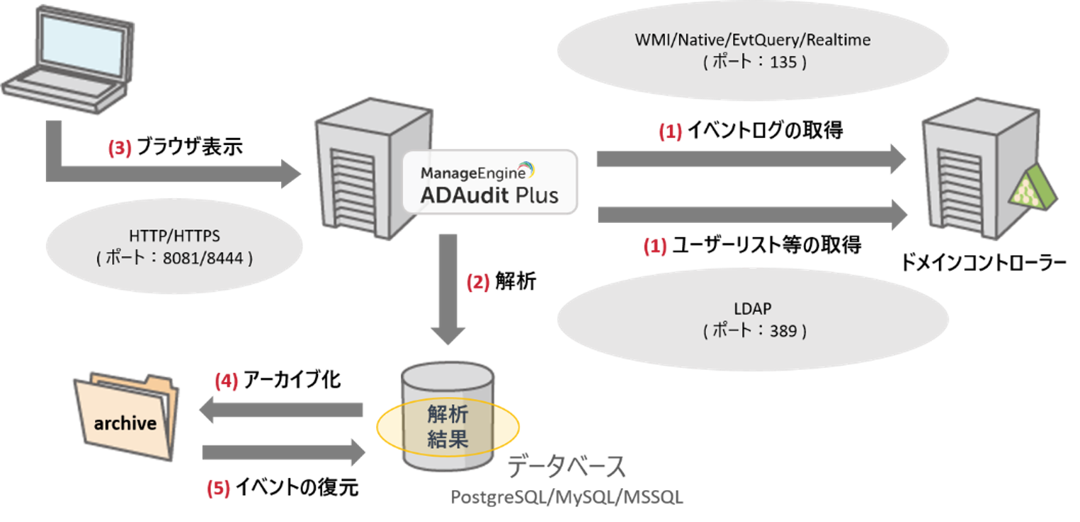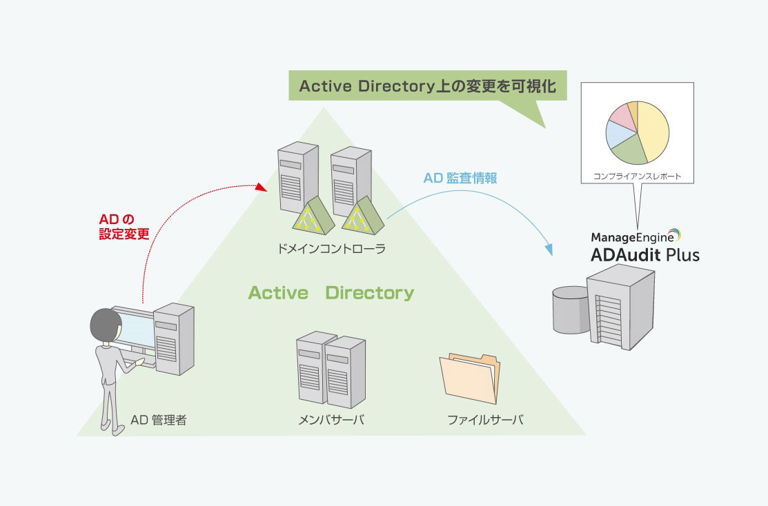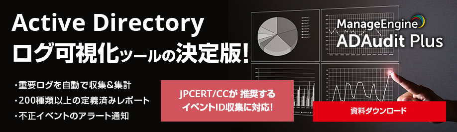 ManageEngine ADAudit Plus(マネージ エンジン エーディーオーディット プラス)は、Active Directoryログの可視化、およびアラート通知などを行う監査支援ツールです。