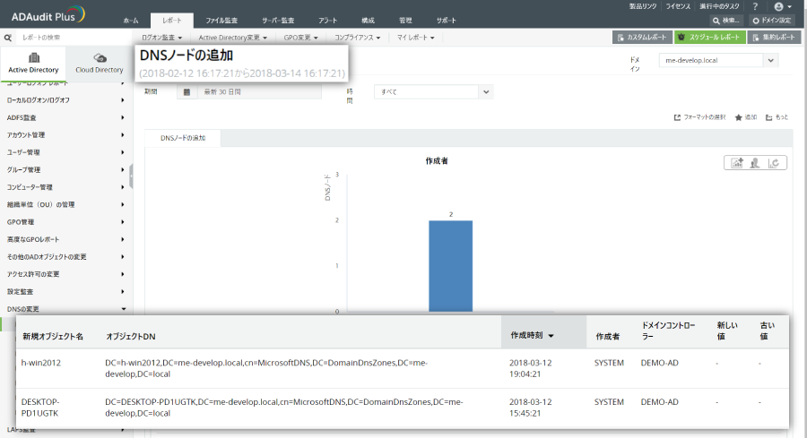 DNSノード、ゾーンの追加、変更、削除アクセス許可の変更のイベントからわかりやすいレポートを生成します。