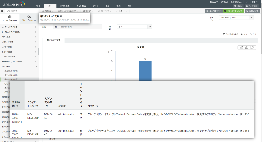 GPOの作成、変更、削除のイベントからわかりやすいレポートを生成します。