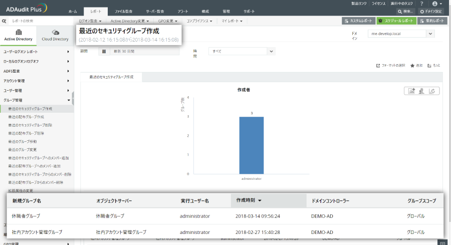 グループの作成、変更、削除、グループへのメンバー追加、削除のイベントからわかりやすいレポートを生成します。
