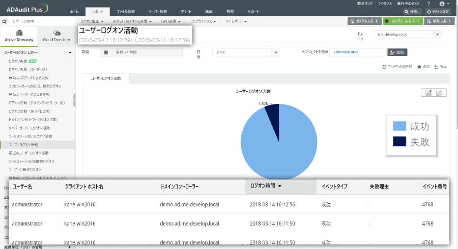 ドメイン認証のログオン/ログオン失敗イベントからわかりやすいレポートを生成します。