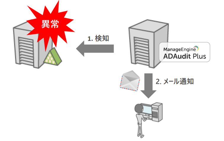 ADAudit Plusは、発生したイベントID/メッセージ/接続元コンピューター/接続ユーザーなどの条件を元に管理者のメールアドレス宛にアラート通知を行えます