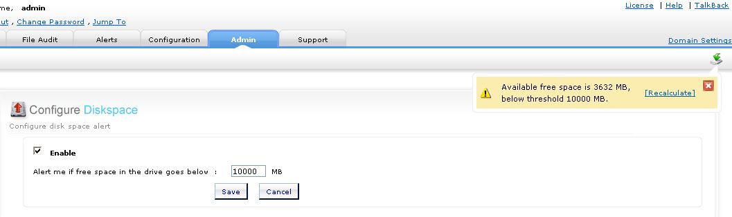 Administratorは空きディスク容量のしきい値を設定することが出来ます。サーバーの空き容量がしきい値を下回った場合、アプリケーションにアラートが表示されます。このアラートは全てのタブから確認することが出来、右上の”ドメイン設定”リンクのすぐ下に表示されます。