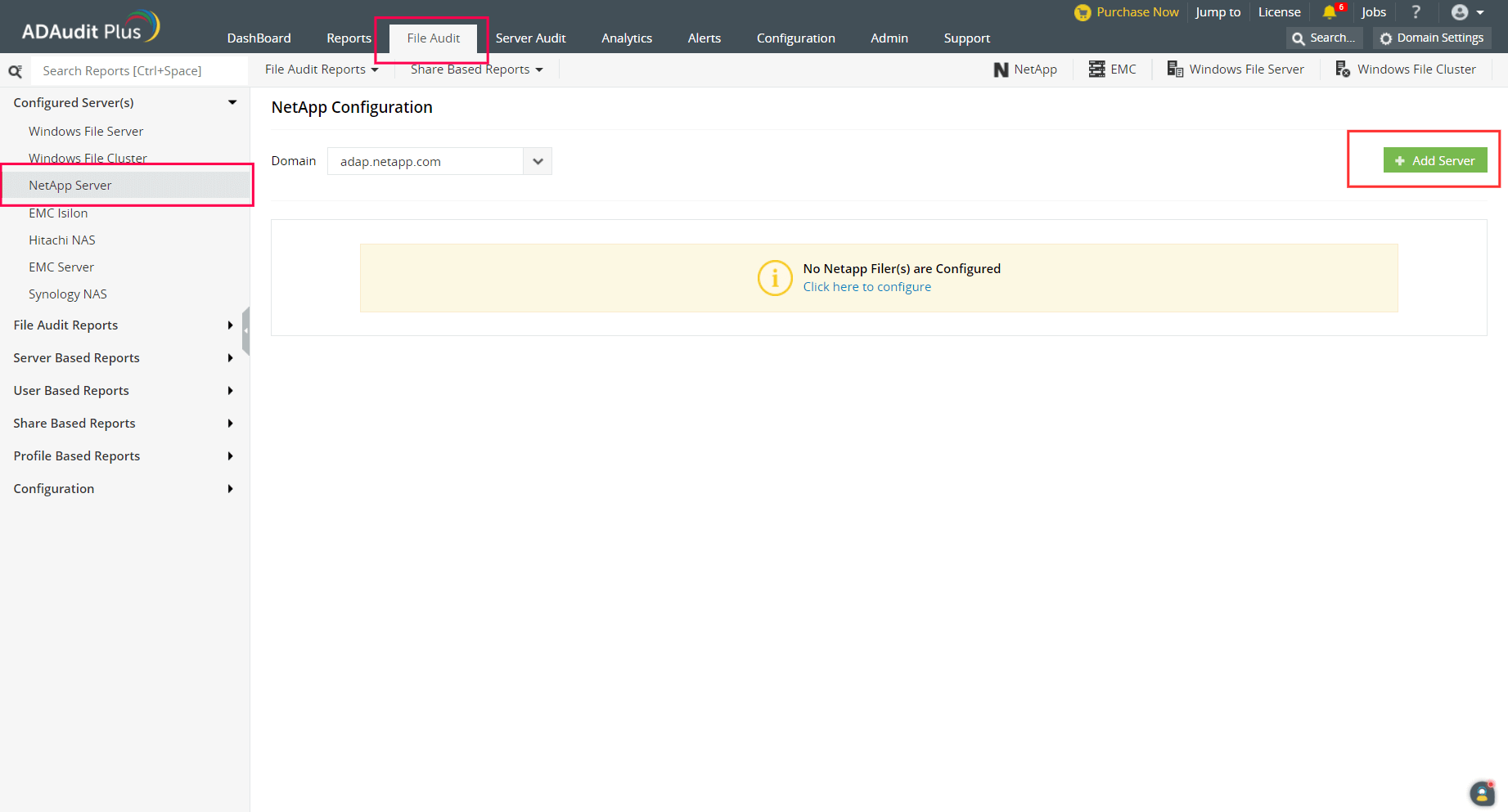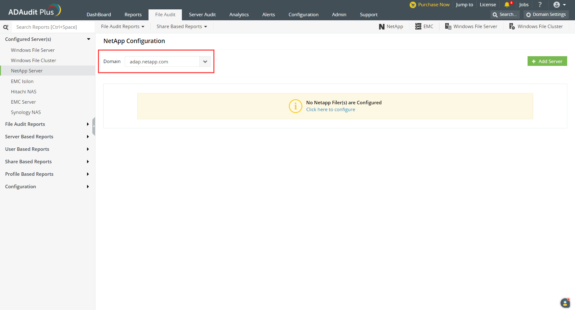 - [ファイル監査] タブ > [設定済みサーバー] > [NetApp Filer]に移動します。追加したいNetAppが存在するドメインを選択します。