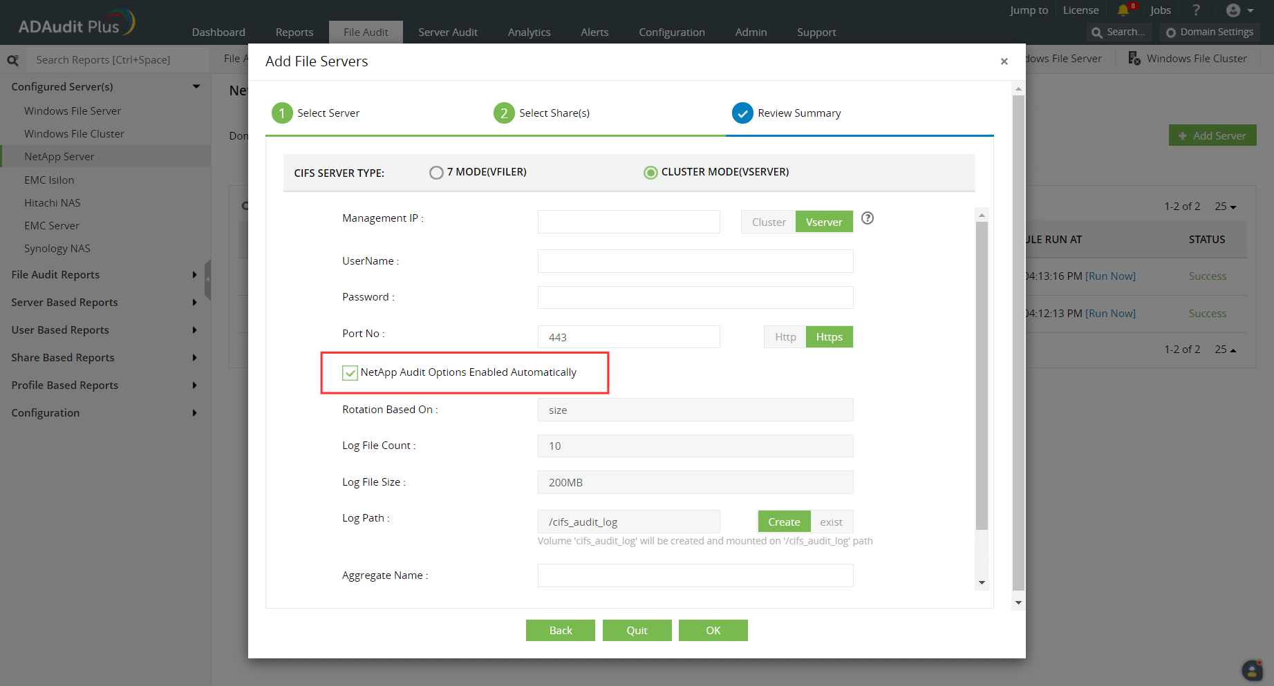 このオプションを有効にすることで、ADAudit Plusはデフォルトの監査ポリシーと以下のパラメーターをNetAppに構成します。