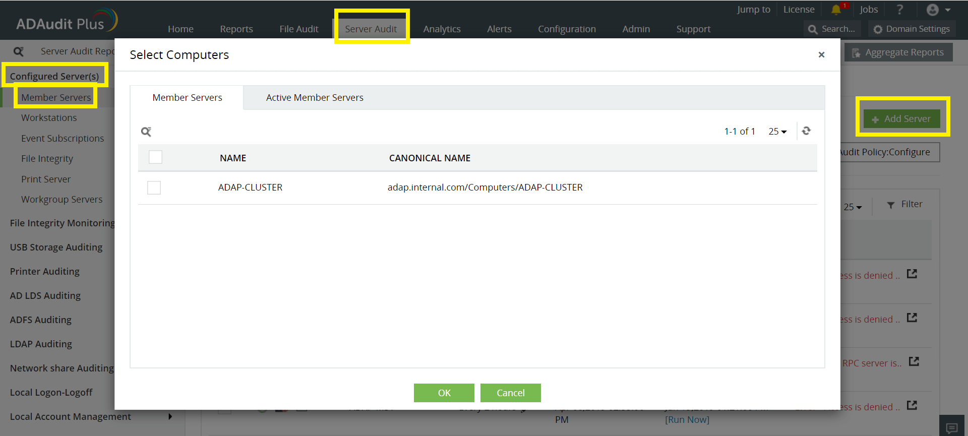 ADAudit Plusにログインします。[サーバー監査]タブ → [設定済みサーバー] → [メンバーサーバー]