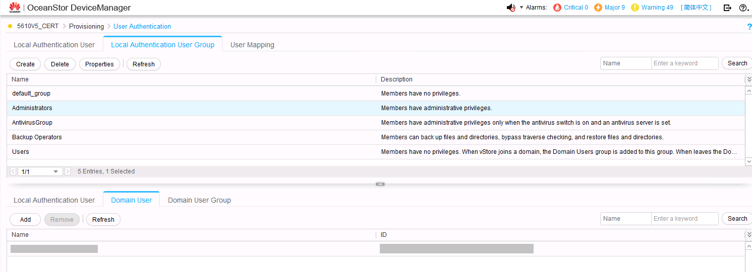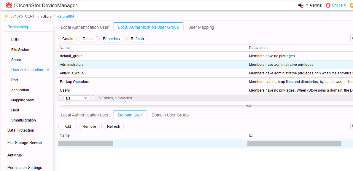 - OceanStor DeviceManager で、ドメイン ユーザーに管理許可を与えるようにドメイン認証サーバーを構成します。