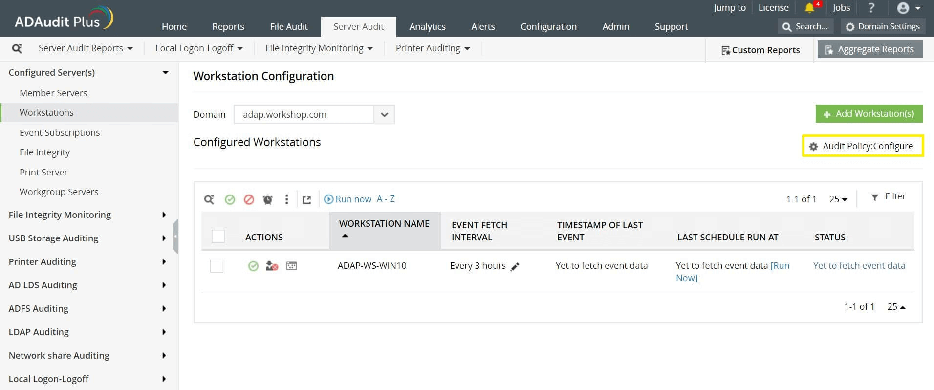 ADAudit Plusにログインします。[サーバー監査]タブ → [設定済みサーバー] → [ワークステーション]