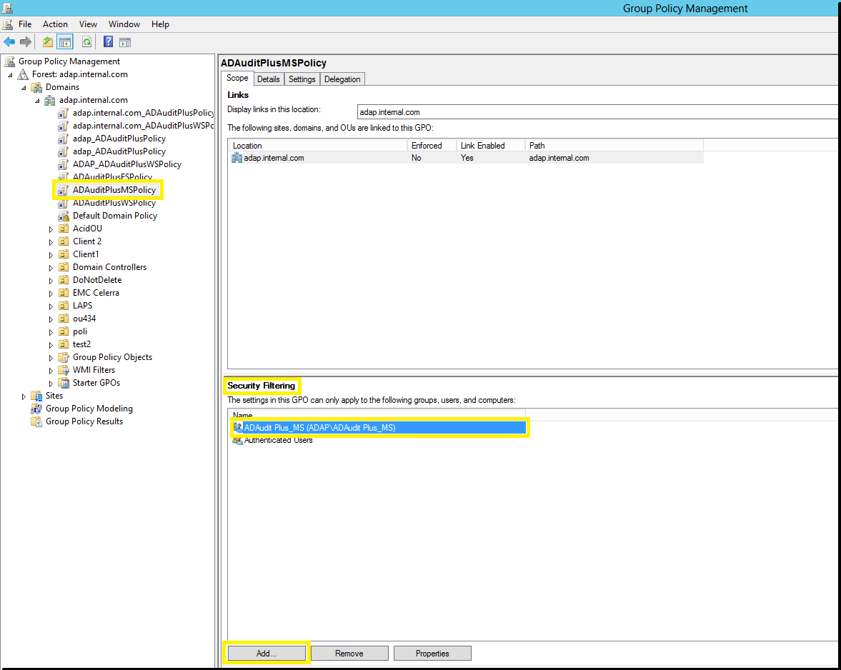 - グループ"ADAuditPlusMS"を、ポリシー"ADAuditPlusMSPolicy"の「セキュリティフィルター処理」に追加します。