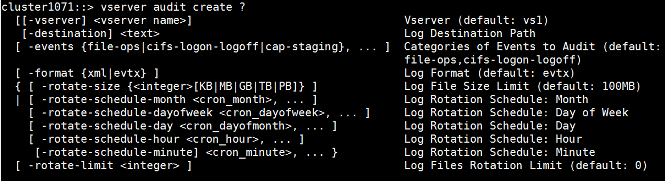 コマンド例: vserver audit create -vserver vs1 -destination /cifs_audit_log -format evtx -rotate-size 200MB -rotate-limit 10