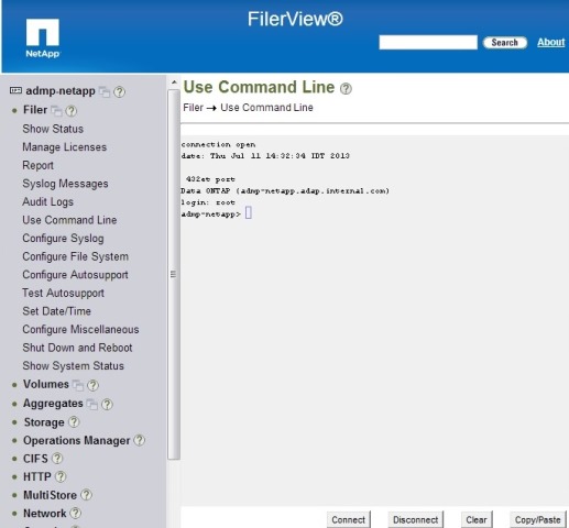 NetApp Filerのコマンド プロンプトにアクセスするには、SSHまたはTelnet接続を使用します。(またはWebインタフェースからアクセスします。)