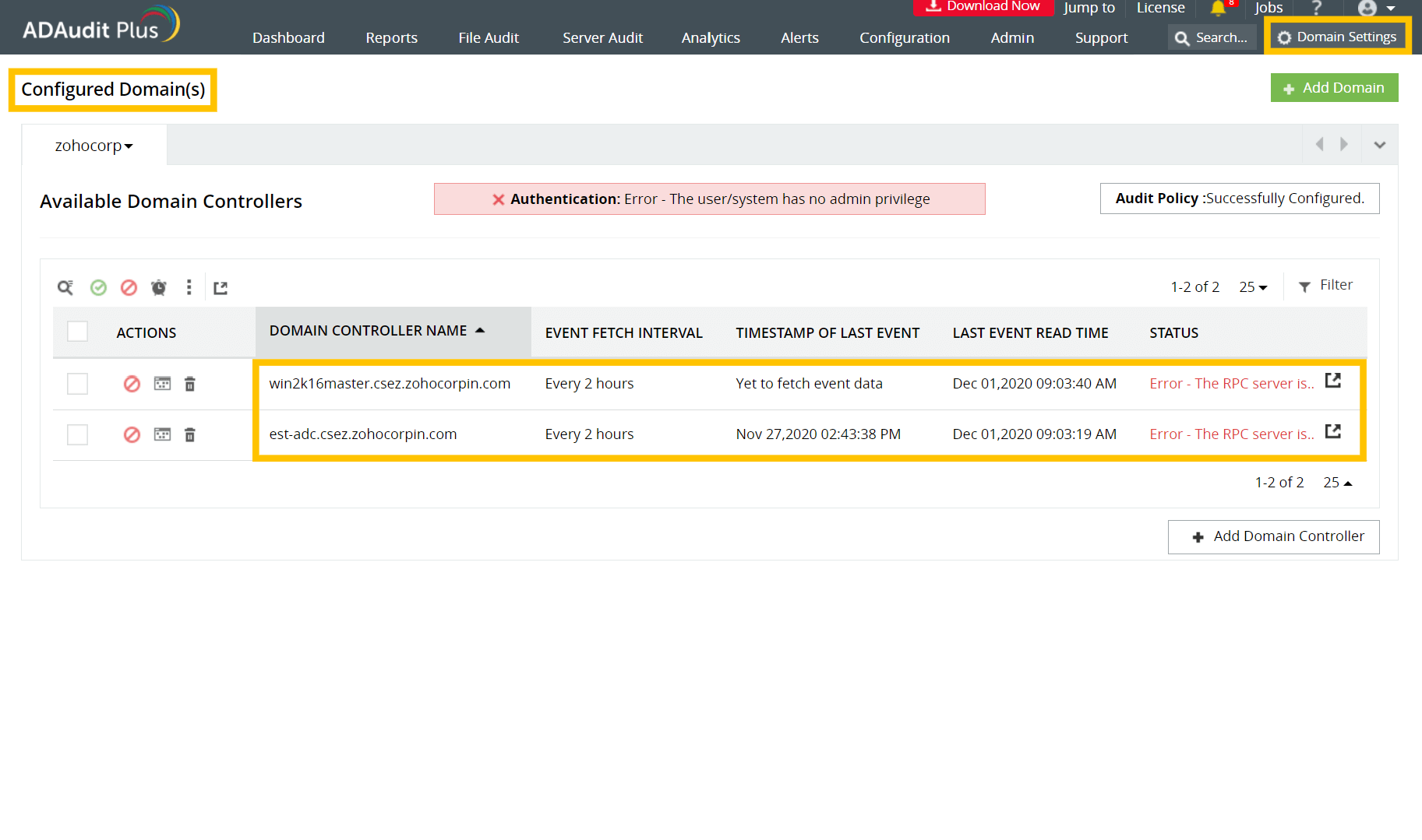 - [ドメイン設定] の [利用可能なドメイン コントローラー] または [ファイル監査] タブの [設定済みサーバー] または [サーバー監査] タブの [設定済みサーバー] で、RPC エラーを示しているサーバーを特定します。