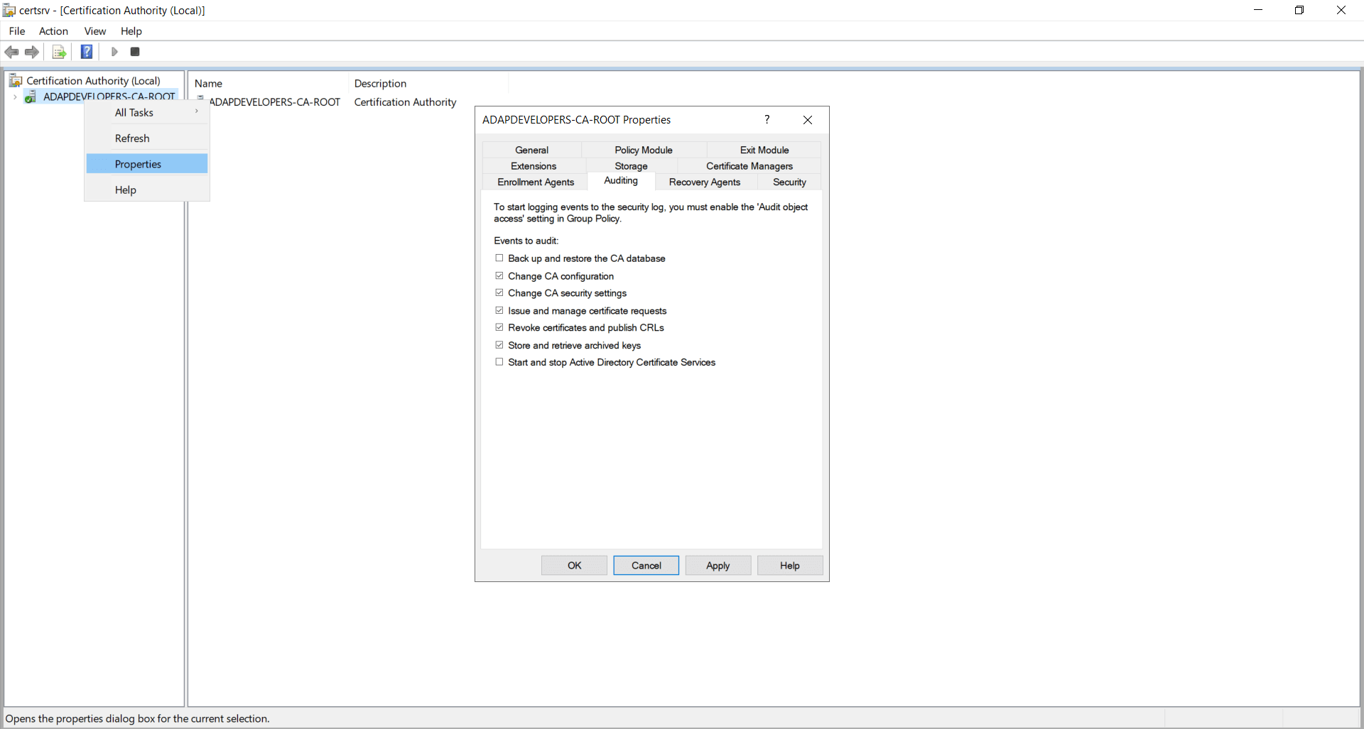 - 認証局管理コンソールを開き、CAを右クリックして、[プロパティ]を選択します。