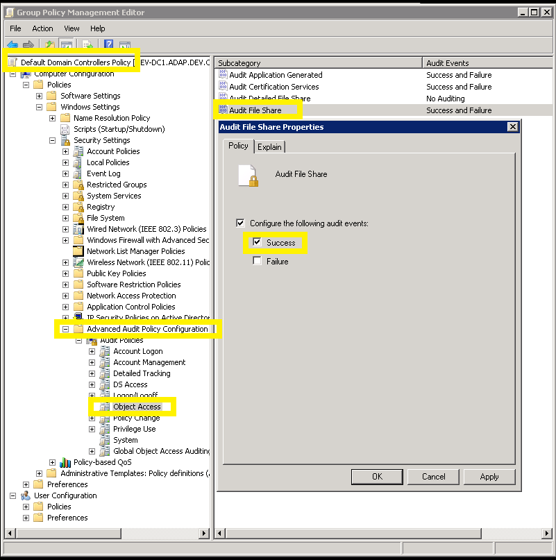 - ファイル整合性監視を実施したいサーバーに適用されているGPOを編集します(ドメインコントローラーであれば「 Default Domain Controllers Policy」)。