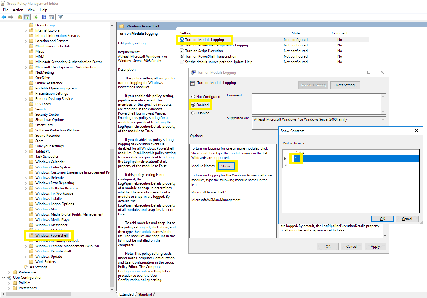 - グループポリシー管理エディターで、[コンピューターの構成] > [ポリシー] > [管理用テンプレート] > [Windows Powershell]に移動します。右パネルに移動し、[モジュールログを有効にする] > [有効]を右クリックします。