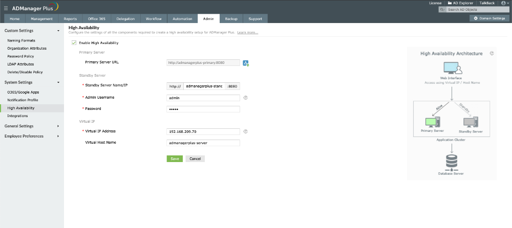 ADManager Plusは、プライマリサーバーに対するシールドとして機能するバックアップサーバーを指定する高可用性アーキテクチャを採用することでこれを実現しています。