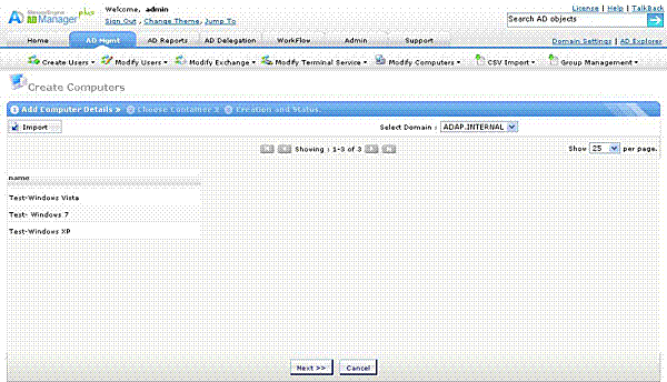 はじめにコンユーターを作成するドメインを選択します。コンピューターの属性情報を含んだCSVファイルをインポートして、適用します。