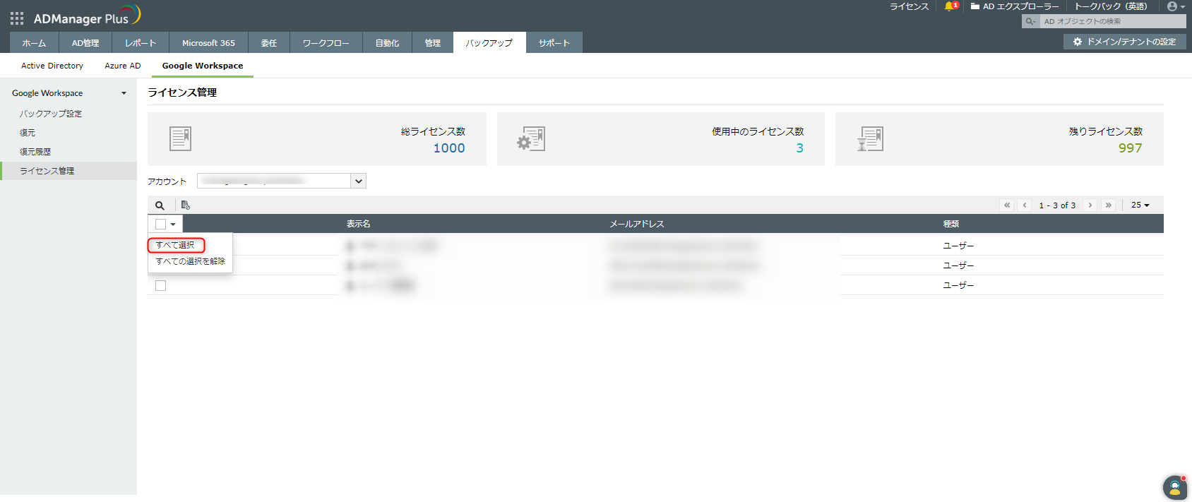 「ライセンス管理」セクションでは、Google Workspaceアカウントのバックアップについて、バックアップに使用するライセンスの管理やバックアップ対象アカウントの選択ができます。