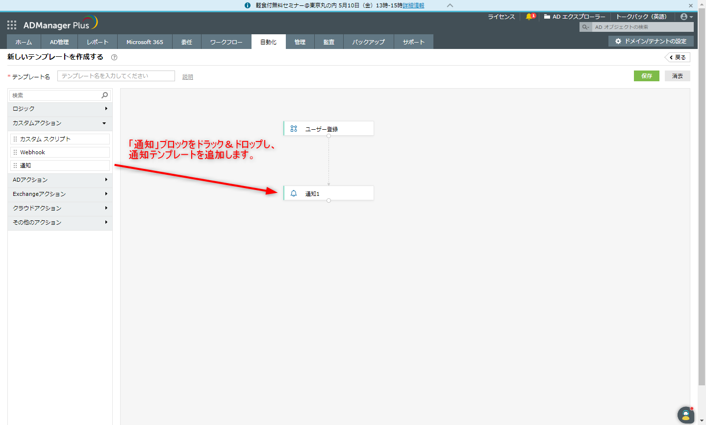 また、IT管理者やマネージャーなどの関係者に通知するために、「通知」ブロックで通知テンプレートを追加します。新しい通知テンプレートを作成するには、こちらの手順を参照してください。