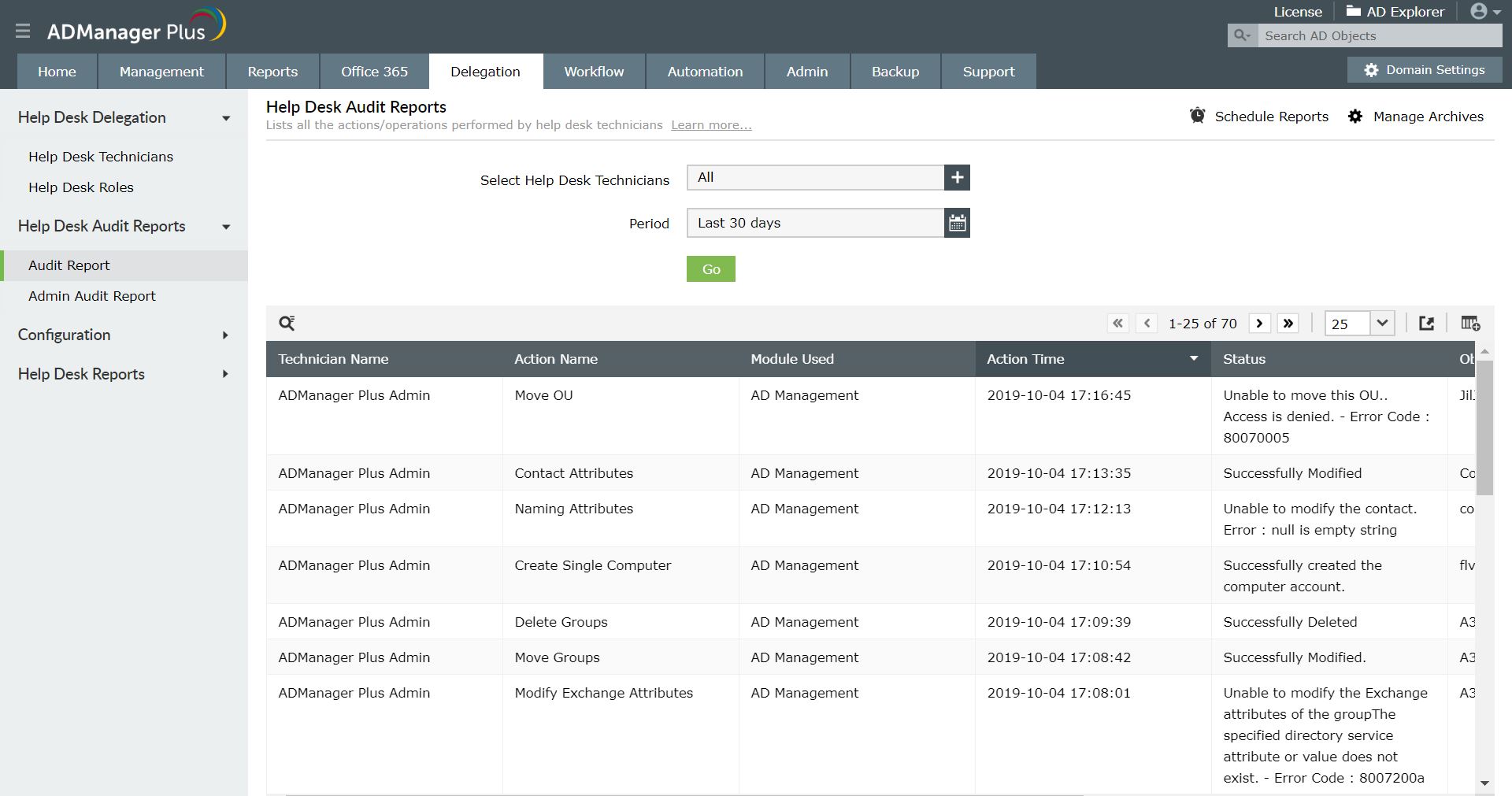 監査レポートは、ADManager Plusを使用してオペレーターが実行したAD管理タスクの詳細を明らかにします。監査レポートは、パスワードのリセット、ユーザーの削除、ユーザーの作成/変更などのイベントを詳細に監視するのに役立つ効果的な追跡ツールです。