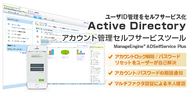 Windows Active Directoryのアカウントロック解除/パスワードリセットの運用をセルフサービス化する、Webベースのソフトウェアです。 全世界18,000社を超える企業や組織で利用されています。ADSelfService Plus へユーザー登録することで、ドメインユーザーは各種セルフサービス機能を利用できます。セルフサービス機能を利用すれば、システム部門やITヘルプデスクを介さず、ドメインユーザー自身で、アカウントのロック解除やパスワードのリセットを実行できます。システム部門やITヘルプデスクへの問い合わせの30~50%を占めるといわれる、アカウントロック解除やパスワードリセットへの対応を、ドメインユーザー自身で解決させることで、 システム部門やITヘルプデスクの運用工数を飛躍的に削減できます。
