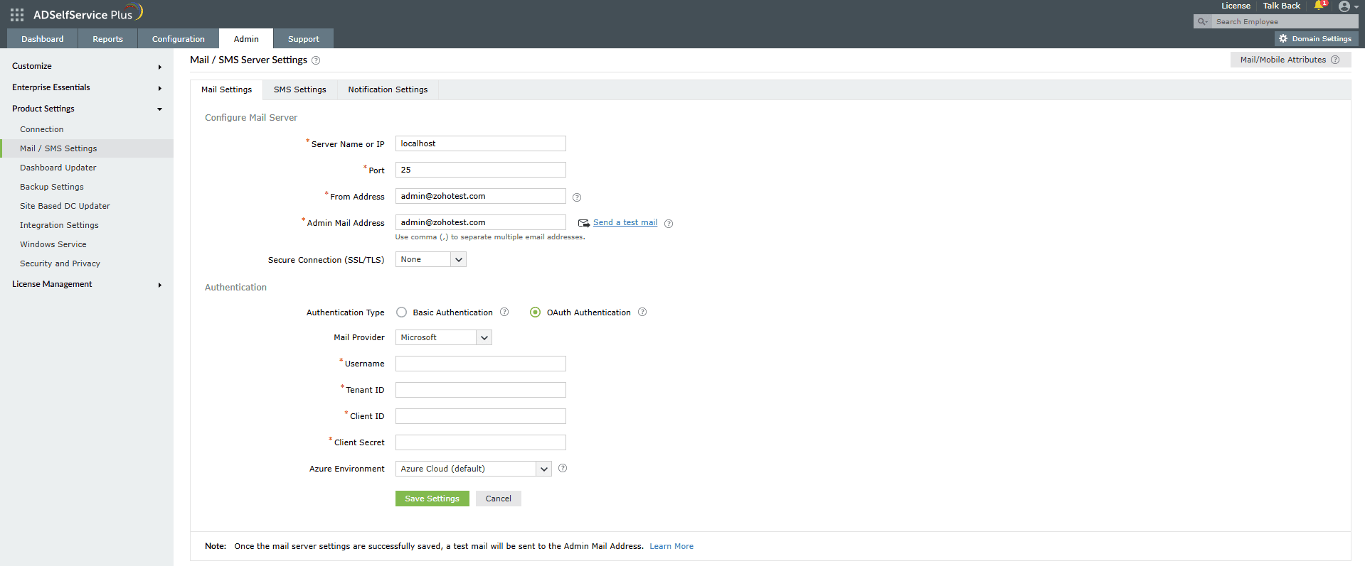 ADSelfService PlusでSMTPメールサーバー設定を構成することで、レポート、通知、およびアラートをメールで送信することができます。