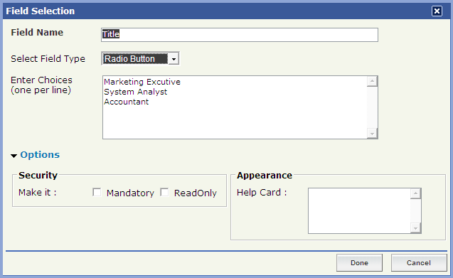 - 表示された「フィールドを選択」ポップアップにて、「フィールドタイプの選択」から「ラジオボタン」を選択します。