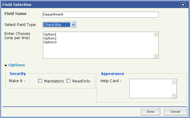 - 表示された「フィールドを選択」ポップアップにて、「フィールドタイプの選択」から「チェックボックス」を選択します。