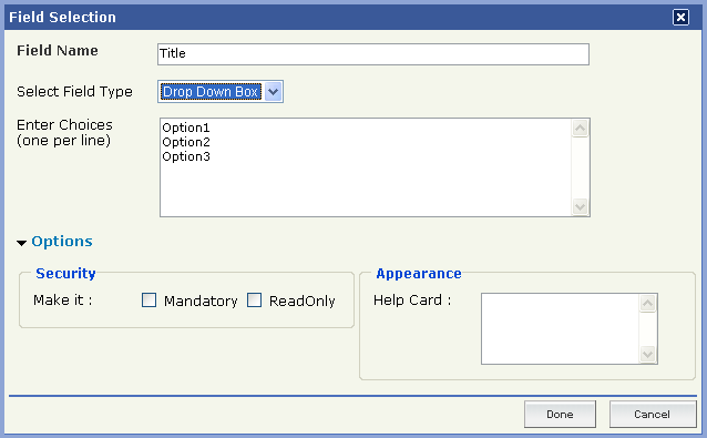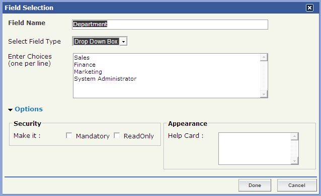 - 表示された「フィールドを選択」ポップアップにて、「フィールドタイプの選択」から「ドロップダウンボックス」を選択します。