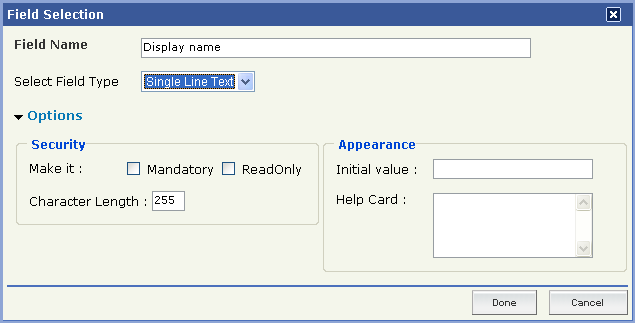 - 表示された「フィールドを選択」ポップアップにて、「フィールドタイプの選択」から「一行テキスト」を選択します。